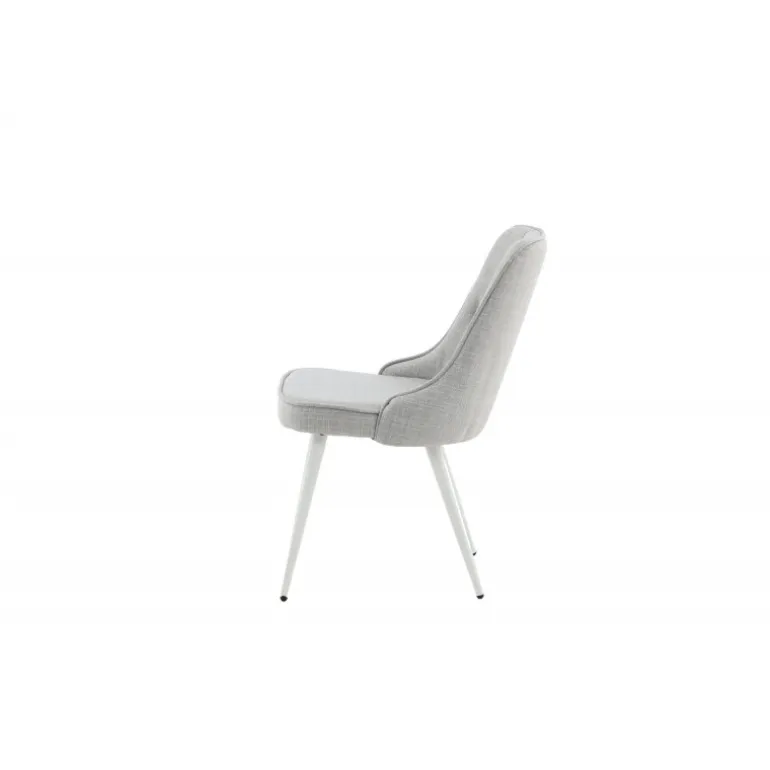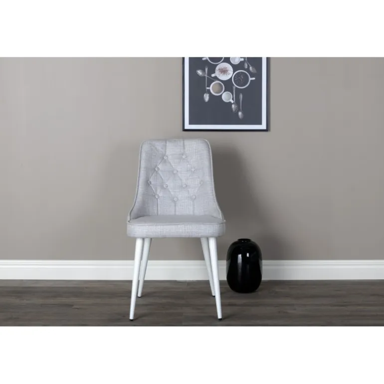 Komfortabel, stilfuld og holdbar spisebordsstol fra serien Velvet Luxury! Stolen har et fuldt beklædt design i slankt gråt polyesterstof med knapper og dekorative syninger i ryggen, der bliver til en flot detalje. Ben i hvid pulverlakeret metal og blød polstring i ryg og sæde for ekstra komfort. Lettere montering er påkrævet. Skab en pompøs blikfang i stuen! Plejeråd: Brug tekstilspray til at imprægnere tekstilet, før du begynder at bruge det, hvilket også vil gøre snavs og pletter lettere at fjerne i fremtiden. Fjern pletter med det samme, gnid ikke, men prøv at suge forsigtigt op med en klud.