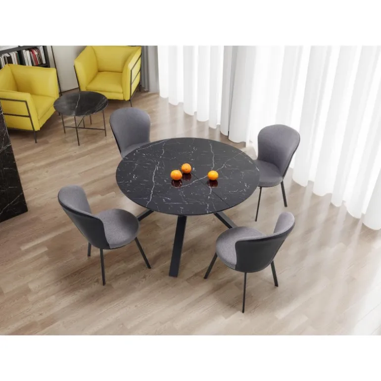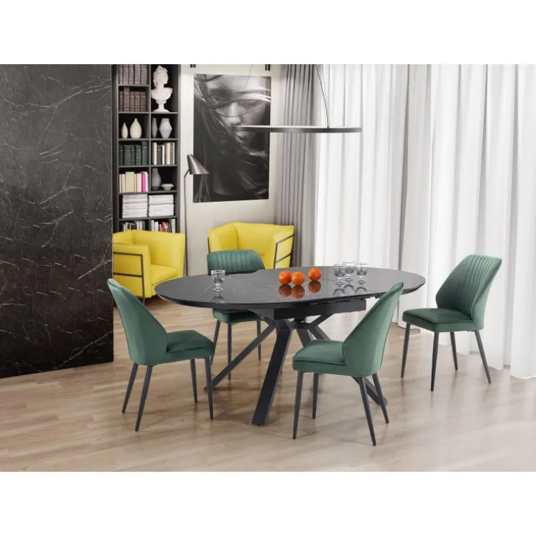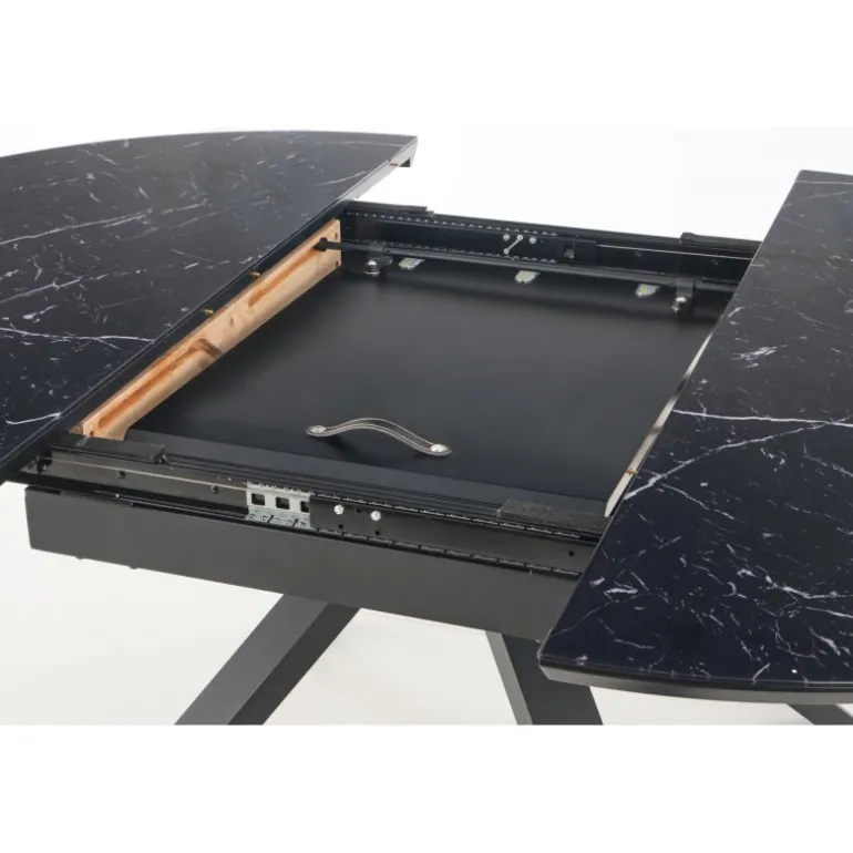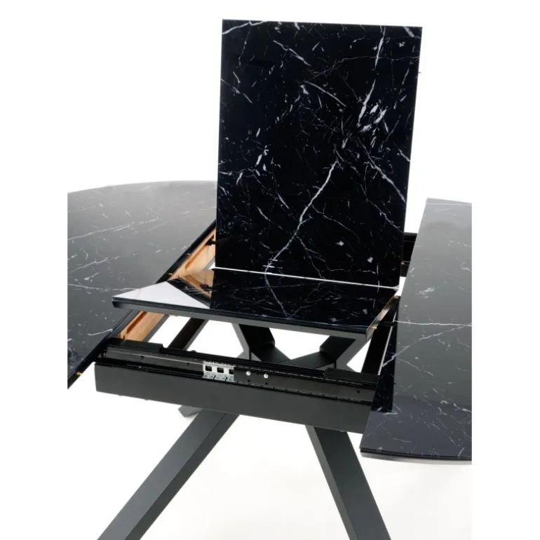 VERTIGO Spisebord med udtræk er det perfekte valg til din spisestue eller køkken. Med en top i Sort marmor og ben i Sort, kombinerer dette bord elegance og funktionalitet. Bordet kan nemt udvides fra 130 cm til 180 cm, hvilket gør det ideelt til både små og store sammenkomster. Lavet af glas, lakeret MDF, og pulverlakeret stål, sikrer det holdbarhed og stabilitet. De elegante materialer og den sofistikerede farve gør det til et iøjnefaldende møbel i ethvert hjem.