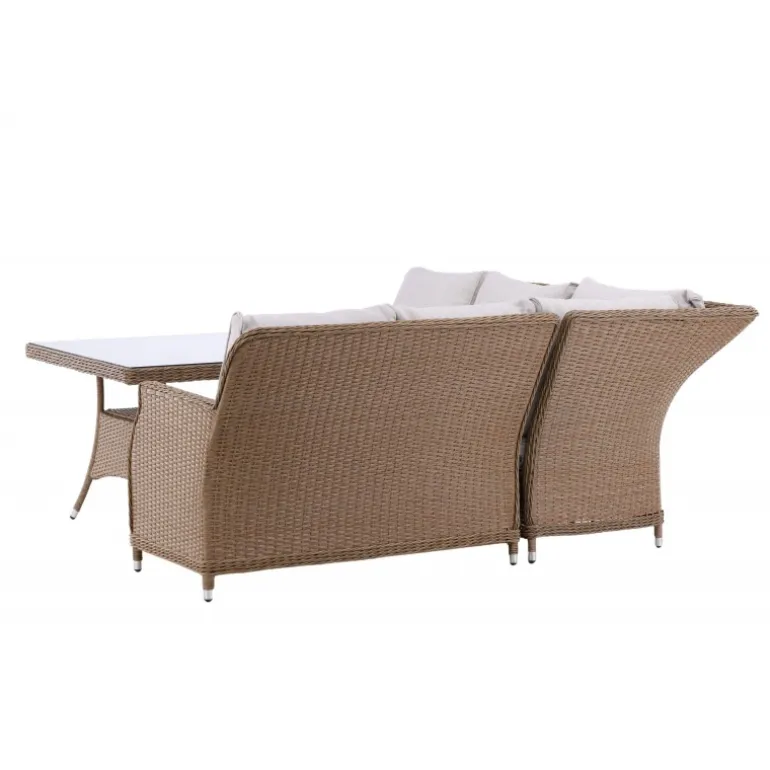 Vikelund Hjørnesofa Sæt i klassisk design fokuserer på god komfort til din terrasse eller patio. Sofaen består af en hjørnesofa med fire sæder og en hjørnedel. Til sofaen medfølger der sandfarvede bløde puder samt et højt sofabord med en relieframme og en stilfuld glasbordplade. Sofaen er fremstillet af en metalramme og naturligt farvet kunstig rattan – lige så praktisk som holdbar! Konstrite er et plastmateriale, der er perfekt til vores skandinaviske klima. Materialet er UV-bestandigt og kan tåle vejr og vind. Selvom møblerne ikke falmer, anbefaler vi altid at opbevare dem under møbelbeskyttelse eller et andet tørt og køligt sted for at forlænge levetiden.