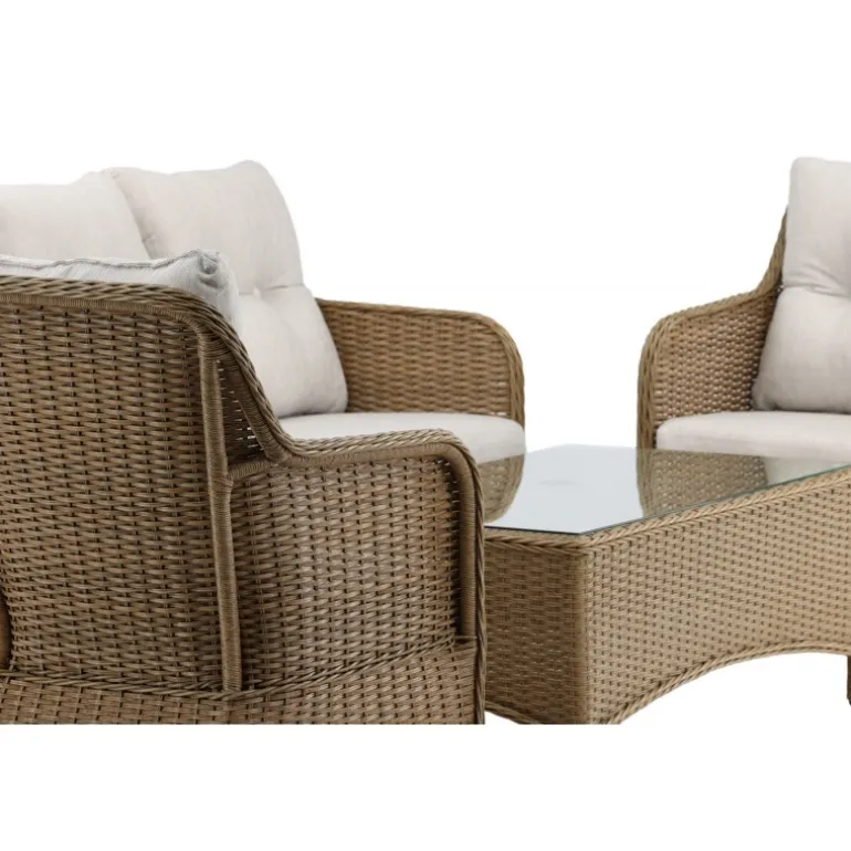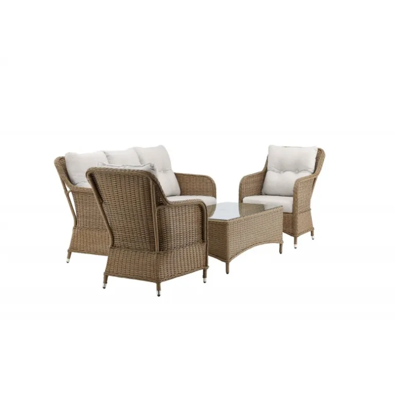 Eksklusivt sofasæt med en kombination af tidløst design og god komfort – perfekt til din terrasse denne sommer! Sofasættet fra Vikelund-serien består af en tresæders sofa, to stel lænestole inklusive bløde, tykke sandfarvede hynder og et lavere, matchende sofabord med en bordplade i stilfuldt glas. Lavet af naturfarvet kunstig rattan med en aluminiumsramme – lige så praktisk som moderne! Plejeråd: Kunstflet er et plastmateriale, der er perfekt til vores skandinaviske klima. Materialet er UV-resistent og kan tåle vejr og vind. UV-resistensen betyder, at møblerne ikke falmer, men vi anbefaler altid at opbevare møblerne under en møbelbeskyttelse eller på et tørt og køligt sted for at forlænge levetiden.
