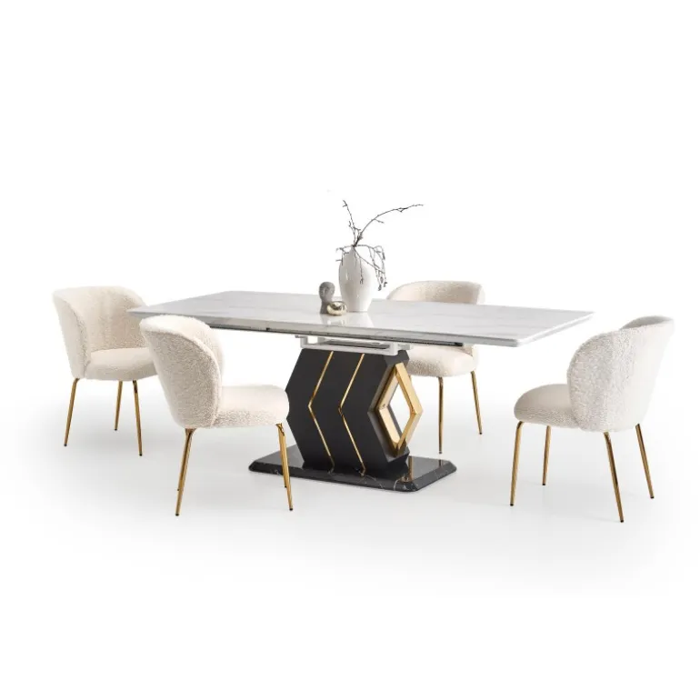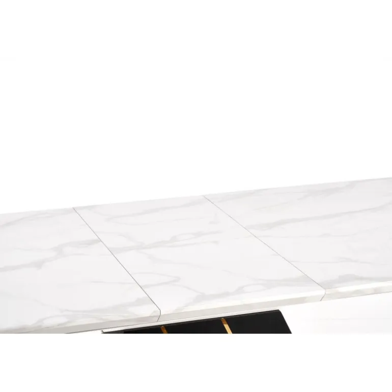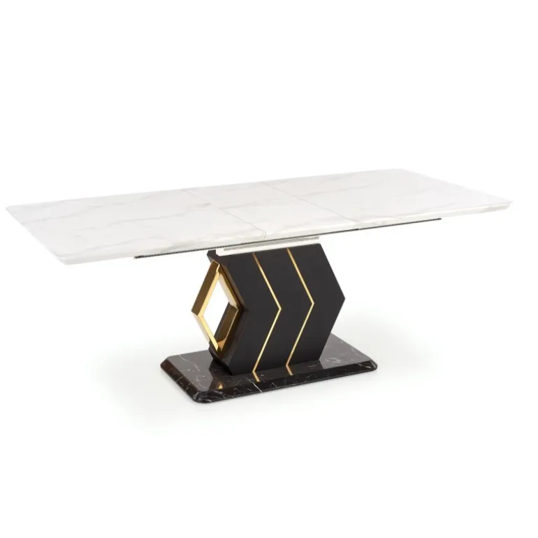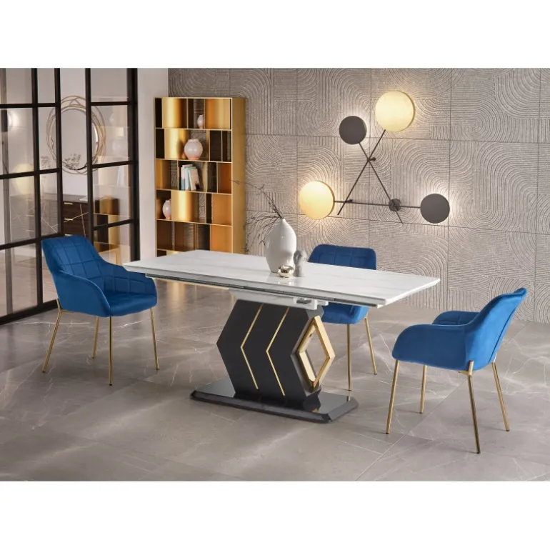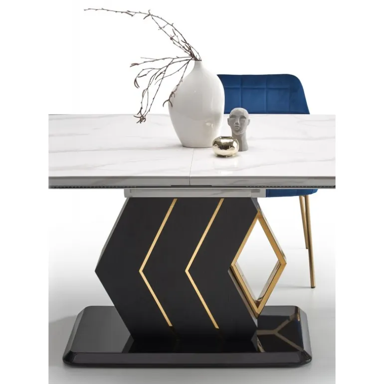Oplev det elegante VINCENZO bord med hvid marmortop og Sort/guld ben, som bringer luksus til dit hjem. Dette Spisebord med udtræk er perfekt til både hverdag og festlige lejligheder. Med dimensionerne 160-200/90/77 cm er det både rummeligt og fleksibelt. Bordpladen er lavet af lamineret MDF, mens benene er i lakeret MDF og kromstål, hvilket giver en robust og holdbar konstruktion. VINCENZO bordet kombinerer stil og funktionalitet og er et must-have til enhver moderne bolig.
