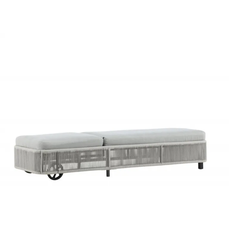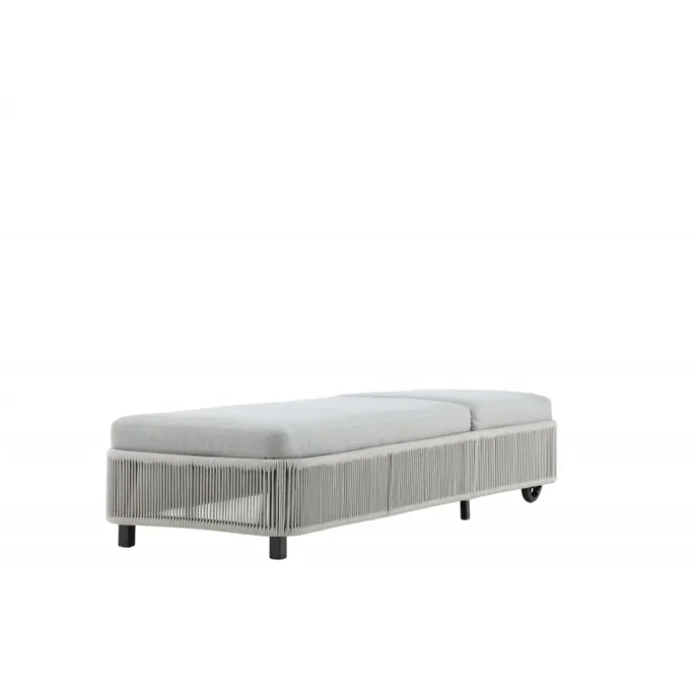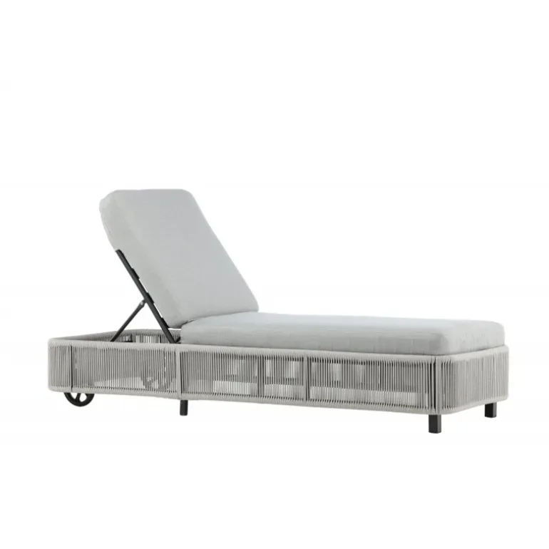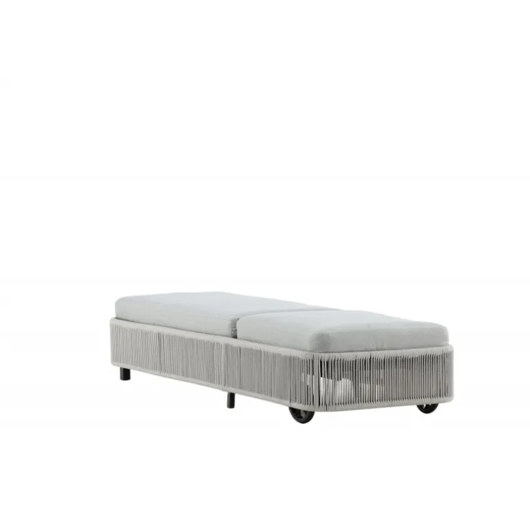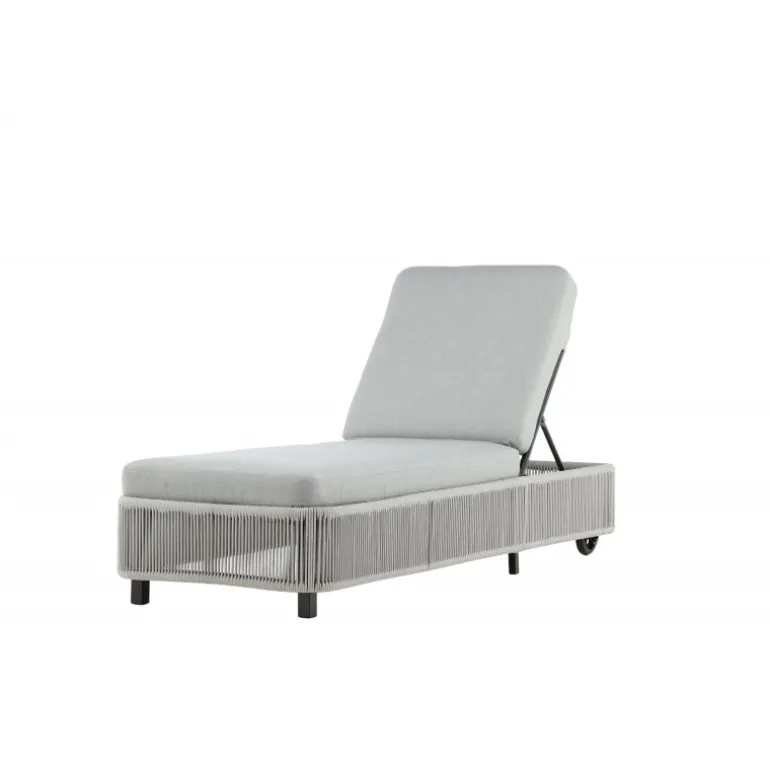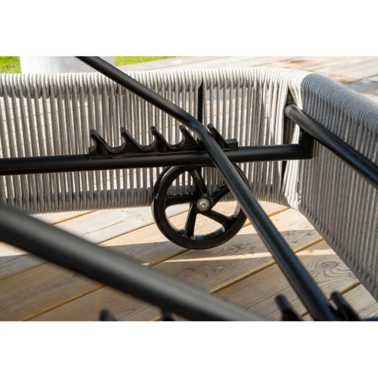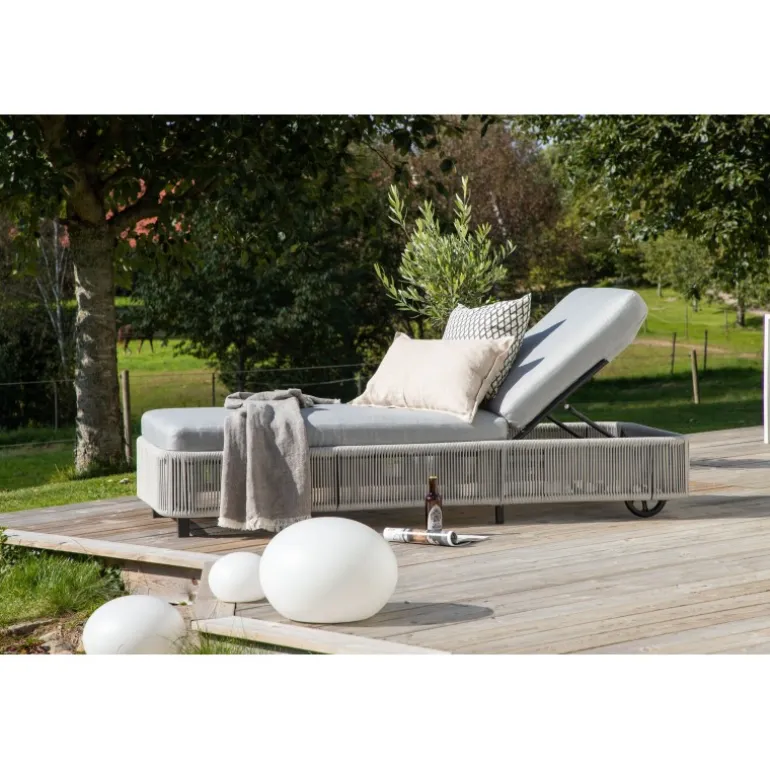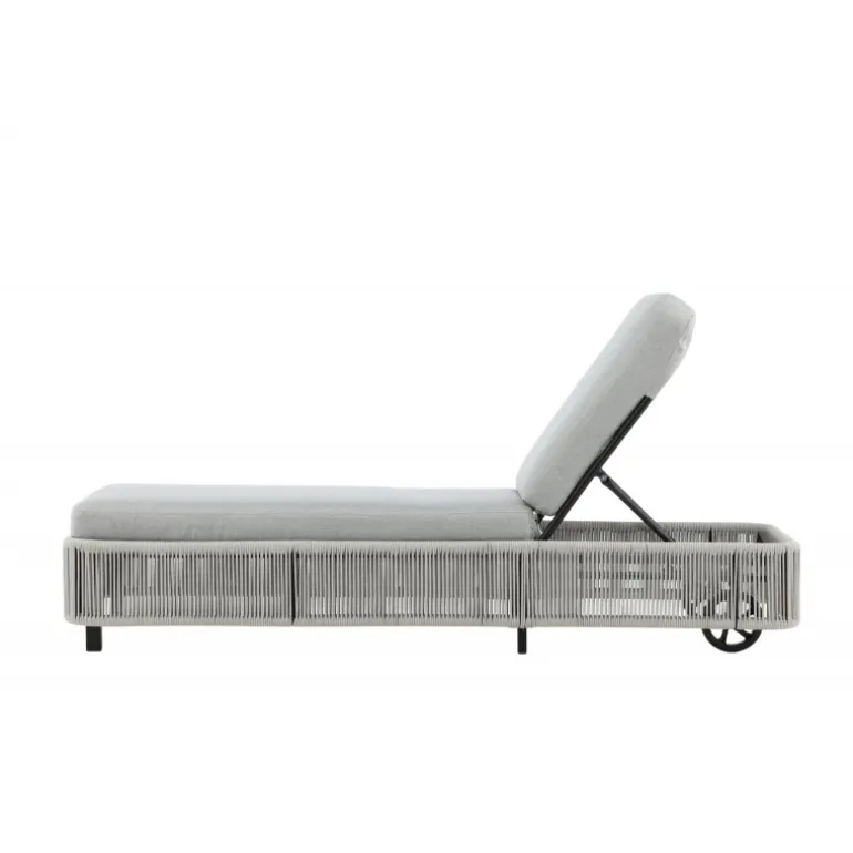 En klassisk solseng fremstillet af grå reb med tilhørende hynder. Placer den præcis hvor du vil, og flyt den nemt ved hjælp af hjulet. Nyd en varm sommerdag i solen på denne komfortable solseng. Fremstillet af holdbart aluminium, der ikke ruster, og leveres med hynder for ekstra komfort.