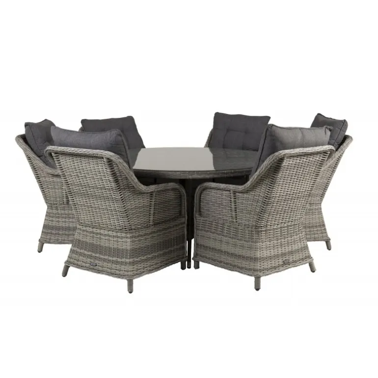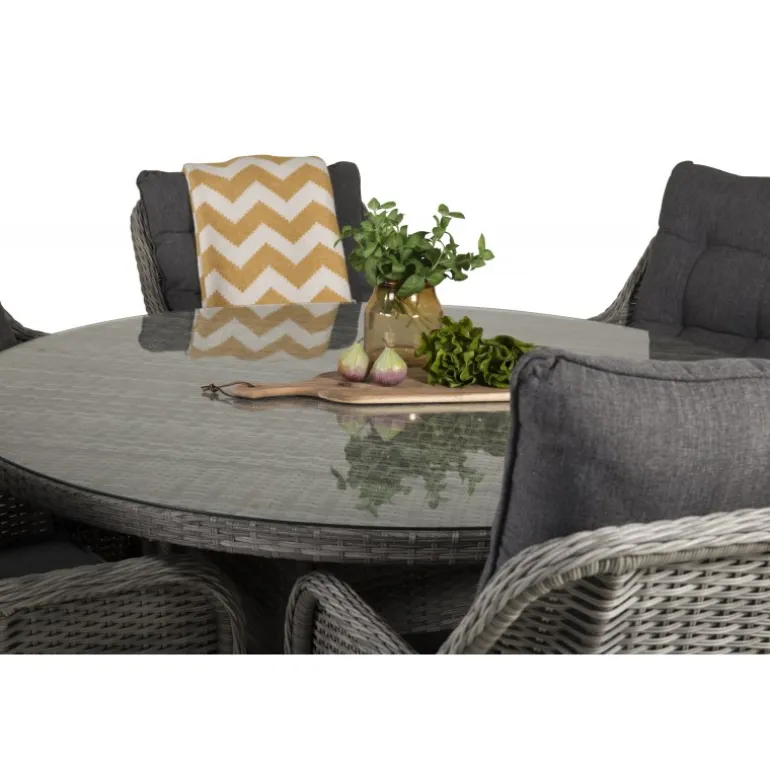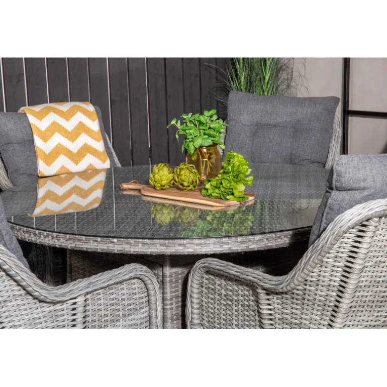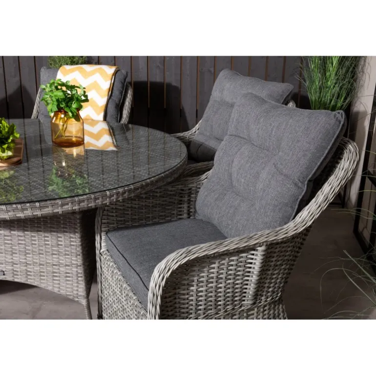 Oplev en fantastisk familie- og sammenholdsfølelse med det Volta Rundt Loungesæt – Havemøbelsæt! Dette sæt består af det elegante Volta spisebord og de robuste Vikelund kunststoftarmsstole, hvilket giver dig et imponerende Loungesæt – Havemøbelsæt, der holder i mange år. Spisebordet har en grå glasbordplade, mens stolene er lavet af bestandigt flet, som er UV-resistent og kan modstå vejr og vind. Inkluderede hynder gør sættet endnu mere komfortabelt og indbydende.