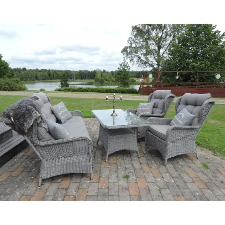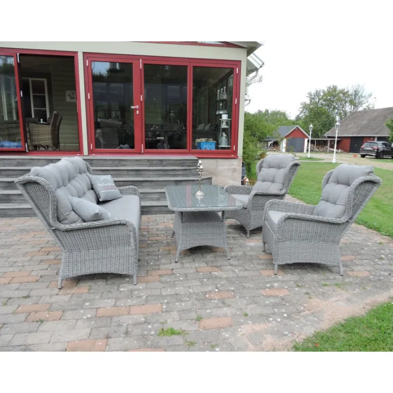 Eksklusivt loungesæt med en kombination af tidløst design og fantastisk komfort til din terrasse eller patio! Sofagruppen fra Washington-serien består af en tre-personers sofa, to lænestole samt et højt sofabord med hylde og glasbordplade. Lavet af lysegrå kunstig rattan med aluminiumsramme. Bløde, tykke lysegrå hynder medfølger. Sid komfortabelt og gør dig klar til denne sommers vidunderlige nætter!