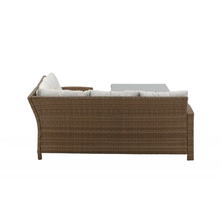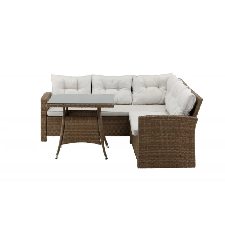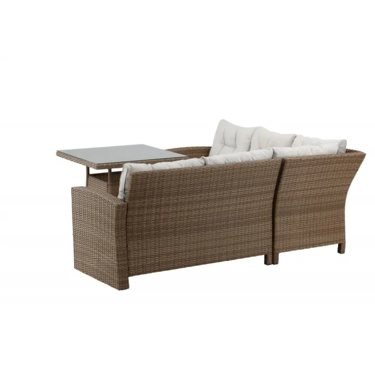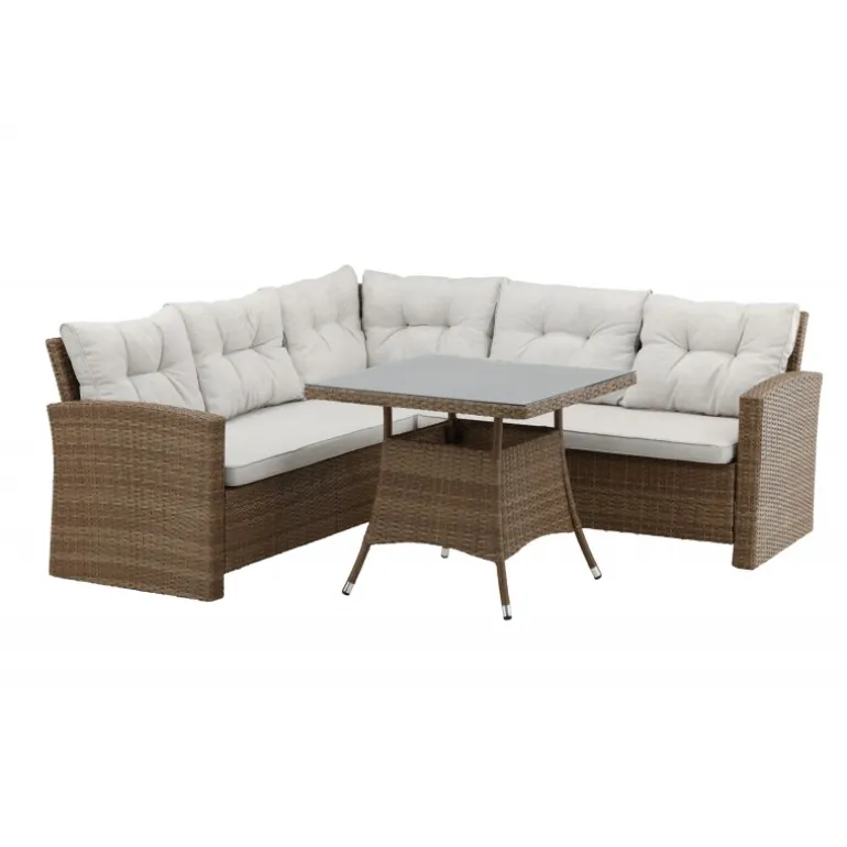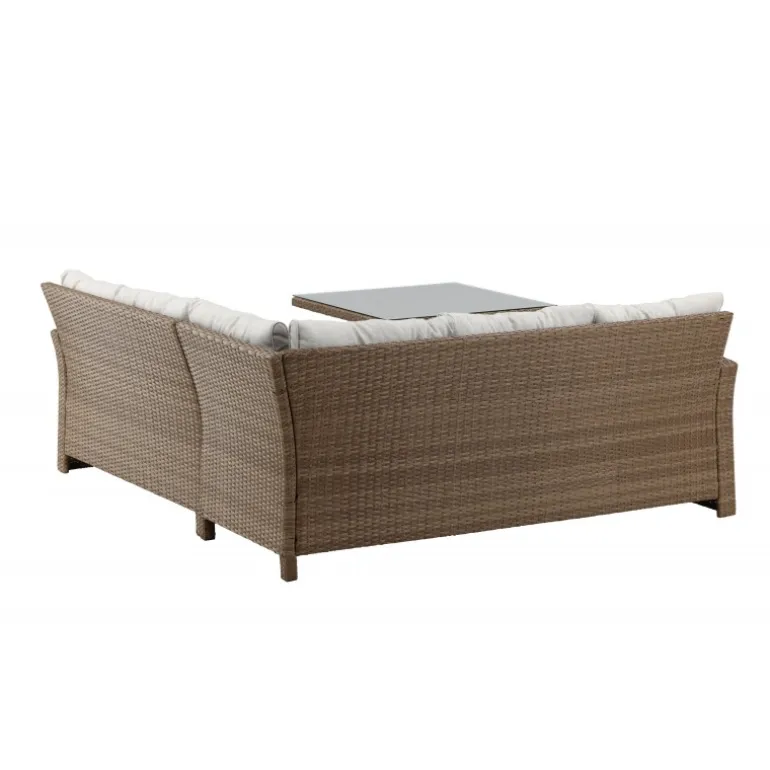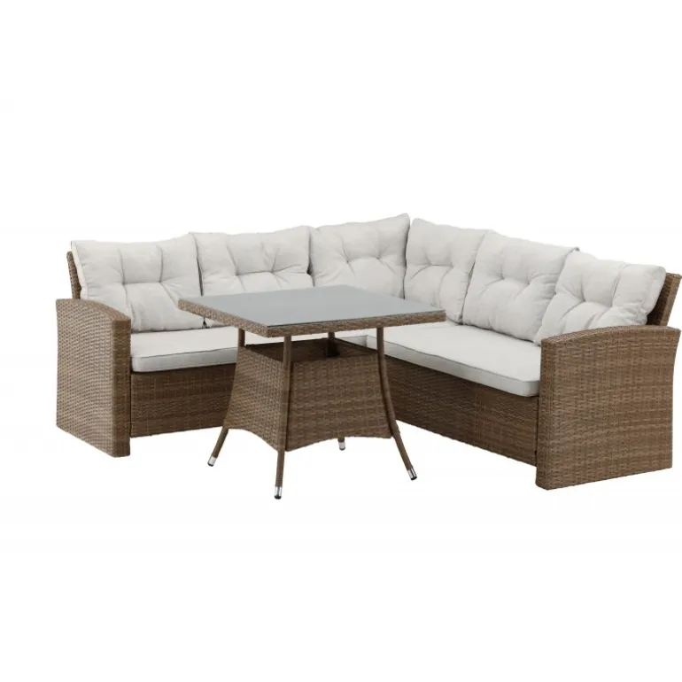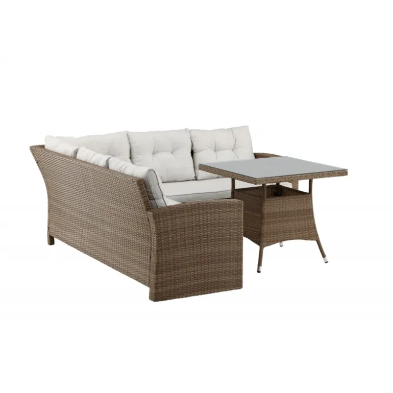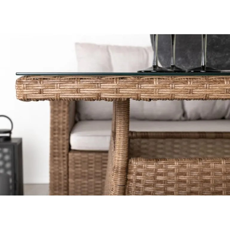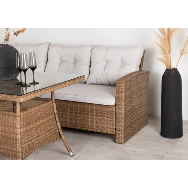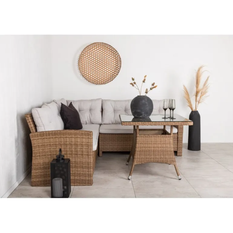 Watford hjørnesofasæt er perfekt til din terrasse eller have og er designet med fokus på komfort og tidløst design. Sofasættet består af en hjørnesofa i naturfarvet kunstflet med 5 sæder og en hjørnedel samt et højere bord i kunstflet med en hylde og en glasbordplade. Sandfarvede, imprægnerede hynder er inkluderet og bidrager til et indbydende look! Plejeanvisning: Kunstflet er et plastmateriale, der er perfekt til det skandinaviske klima. Materialet er UV-resistent og kan modstå vejr og vind. Selvom det er UV-resistent og ikke falmer, anbefales det altid at opbevare møblerne under et møbelovertræk eller et andet tørt og køligt sted for at forlænge levetiden.