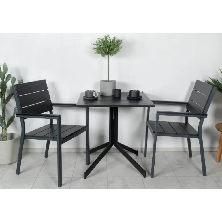 Det klassiske cafébord Way er en succes på de fleste terrasser. Her er bordet kombineret med to spisebordsstole fra Levels-serien, som er et ægte designikon og passer lige godt i både klassiske og moderne miljøer. Et lille, smukt og moderne Loungesæt – Havemøbelsæt i elegant sort farve, der passer perfekt på altanen eller balkonen!