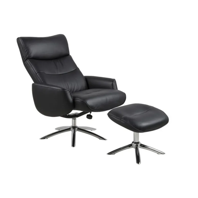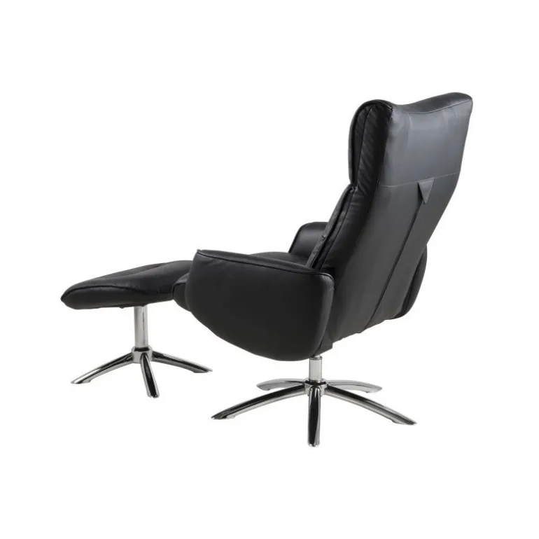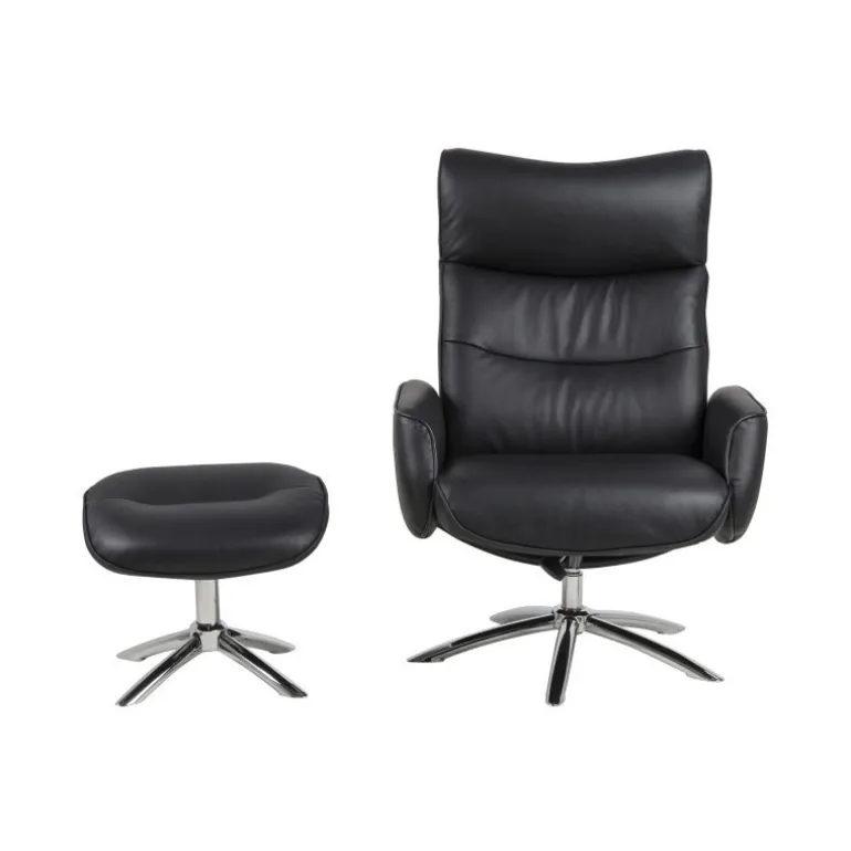 Komfortabel lænestol betrukket med sort læder inkl. fodskammel. Lænestolens sæde og ryg er polstret med et tykt lag koldskum, hvilket sikrer en yderst behagelig siddekomfort.
