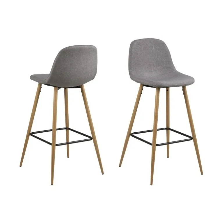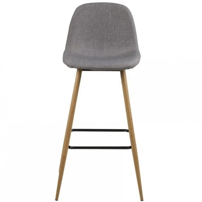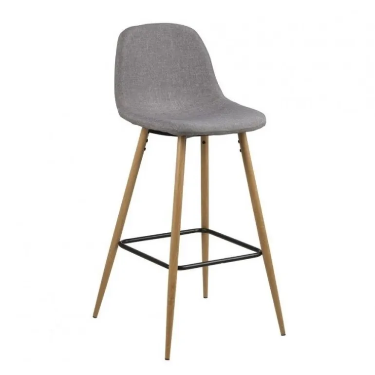 Flot barstol med formstøbt gråt stofsæde og skrå ben i lyst lakeret træ. En elegant og funktionel stol, der både behager ryggen og øjet.