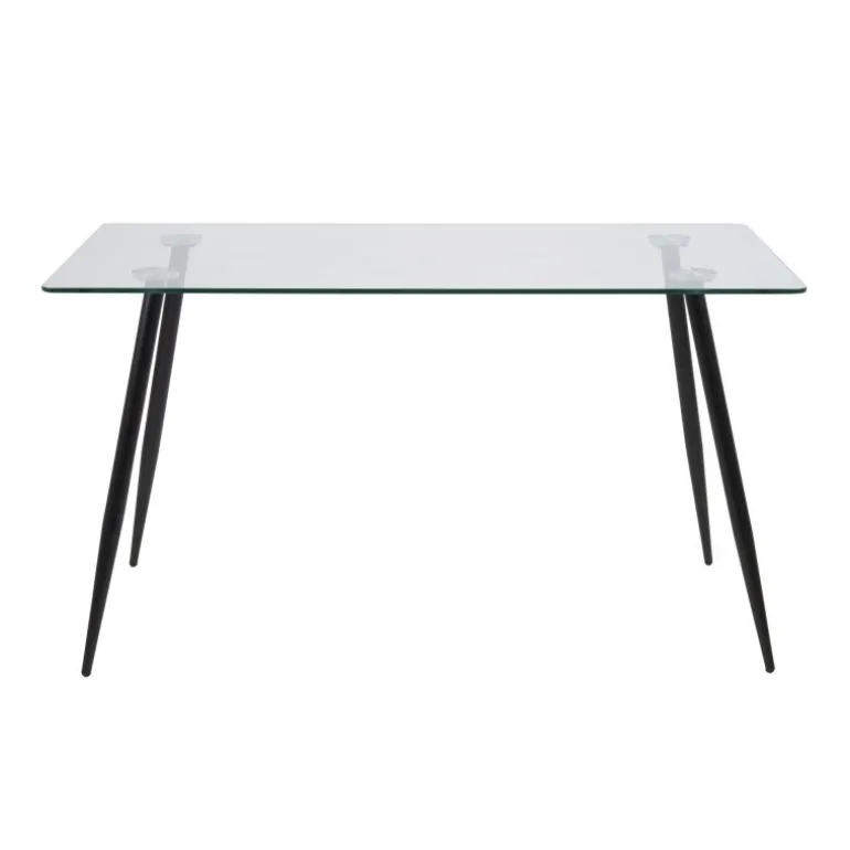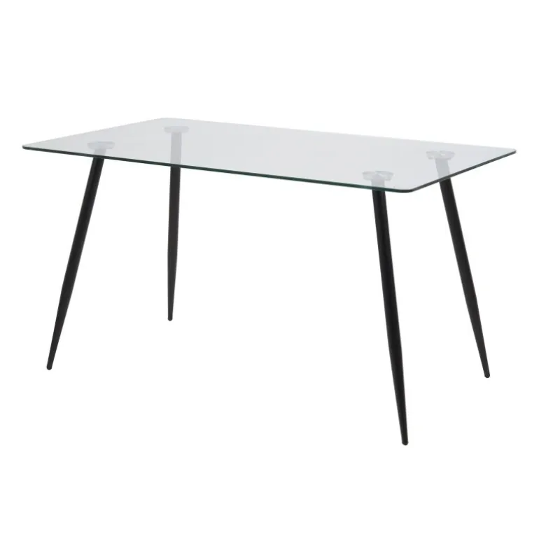 Elegant spisebord i moderne high tech design med 10 mm tyk bordplade i glas monteret på slanke skrå ben i sort metal.