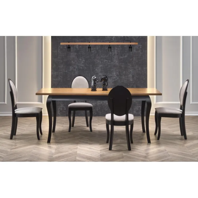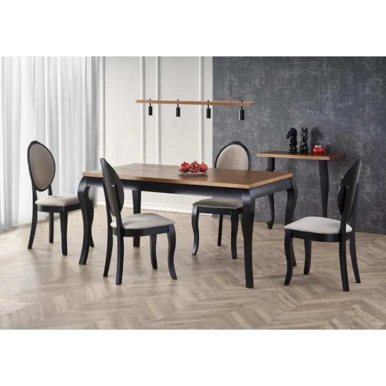 Oplev WINDSOR Spisebord med udtræk i stilfuld mørk eg og Sort, perfekt til både moderne og klassiske hjem. Dette bord kan nemt udvides fra 160 cm til 240 cm, hvilket gør det ideelt til både små og store sammenkomster. Bordpladen er lavet af møbelplade med naturlig egetræsfinér, mens benene er fremstillet af massivt bøgetræ, hvilket sikrer holdbarhed og lang levetid. Med sit elegante design og praktiske funktioner er WINDSOR bordet en fremragende tilføjelse til enhver spisestue.