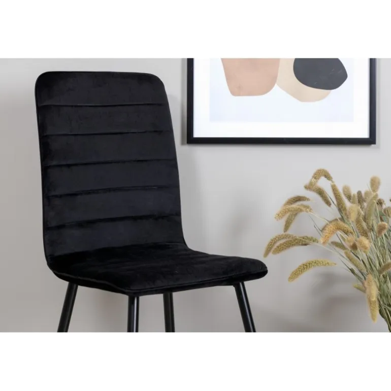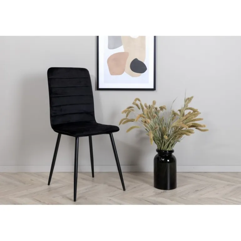 Solid og fløjlsblød spisebordsstol, der fanger øjet og imponerer med både komfort og stil! Windu luksusstol har et konsekvent sort design med lige nordiske former. Stolen er i sort fløjl og polyesterstof, og stolens ben er let udfladede i jern. Match med et overdådigt spisebord for at fuldende et spisebordssæt, der vil pryde hjemmets hjerte! Vedligeholdelsesråd: Fløjl har tendens til at få aftryk, når luven lægger sig ned. Indtrykkene kan få stoffet til at se slidt ud, hvilket er helt normalt for denne type materiale. Afhængigt af hvordan lyset falder, kan stoffet skifte i flere forskellige nuancer.