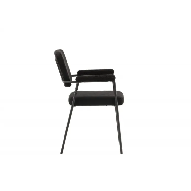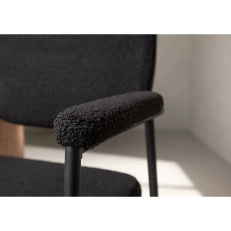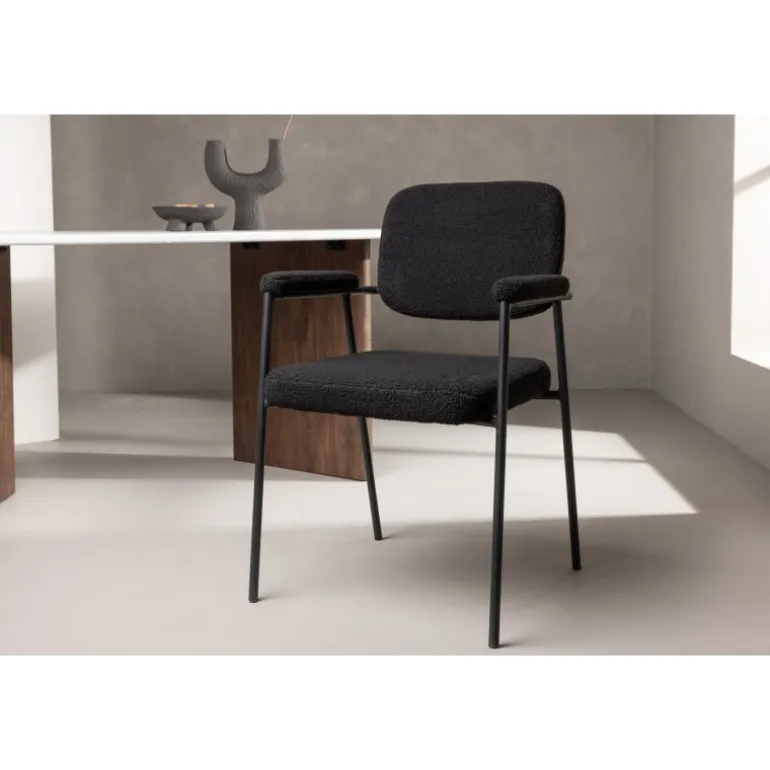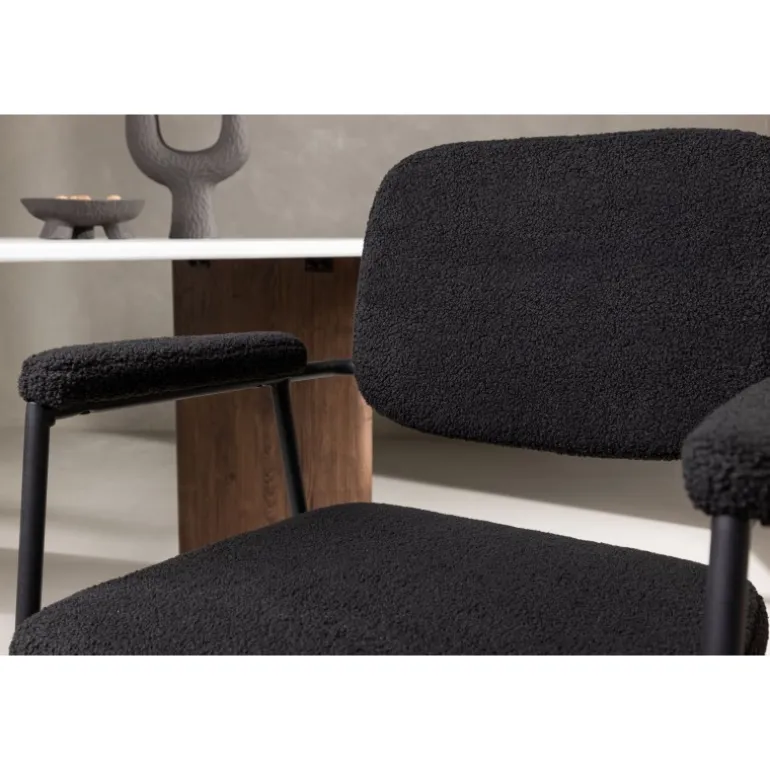 Indret dit hjem med charmerende og indbydende spisebordsstole fra Yesterday-serien! Denne lækre stol i skandinavisk design har et fuldt polstret sæde i sort bouclé-stof og slanke stoleben med integrerede armlæn i sort metal. Det bløde sæde er stoppet for ekstra komfort og inviterer til lange, hyggelige middagsstunder. Match med et flot spisebord for at få en komplet Spisebordssæt til hjemmets hjerte!